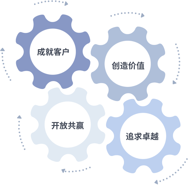 成就客户是一切决策的出发点,,,,创造价值是衡量所有工作的标准,,,追求卓越是我们做事做人的态度,,,,开放共赢是我们的格局也是最终的结果。。。。价值观的齿轮环环相扣,,推动着组织里的每个人不断向前。。。。